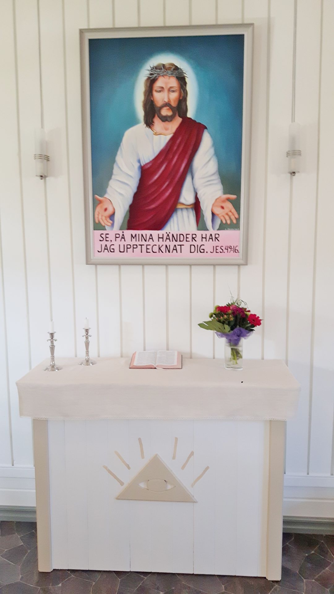 Altaret i bönehuset med altarmålningen målad av Göte Edsvik .